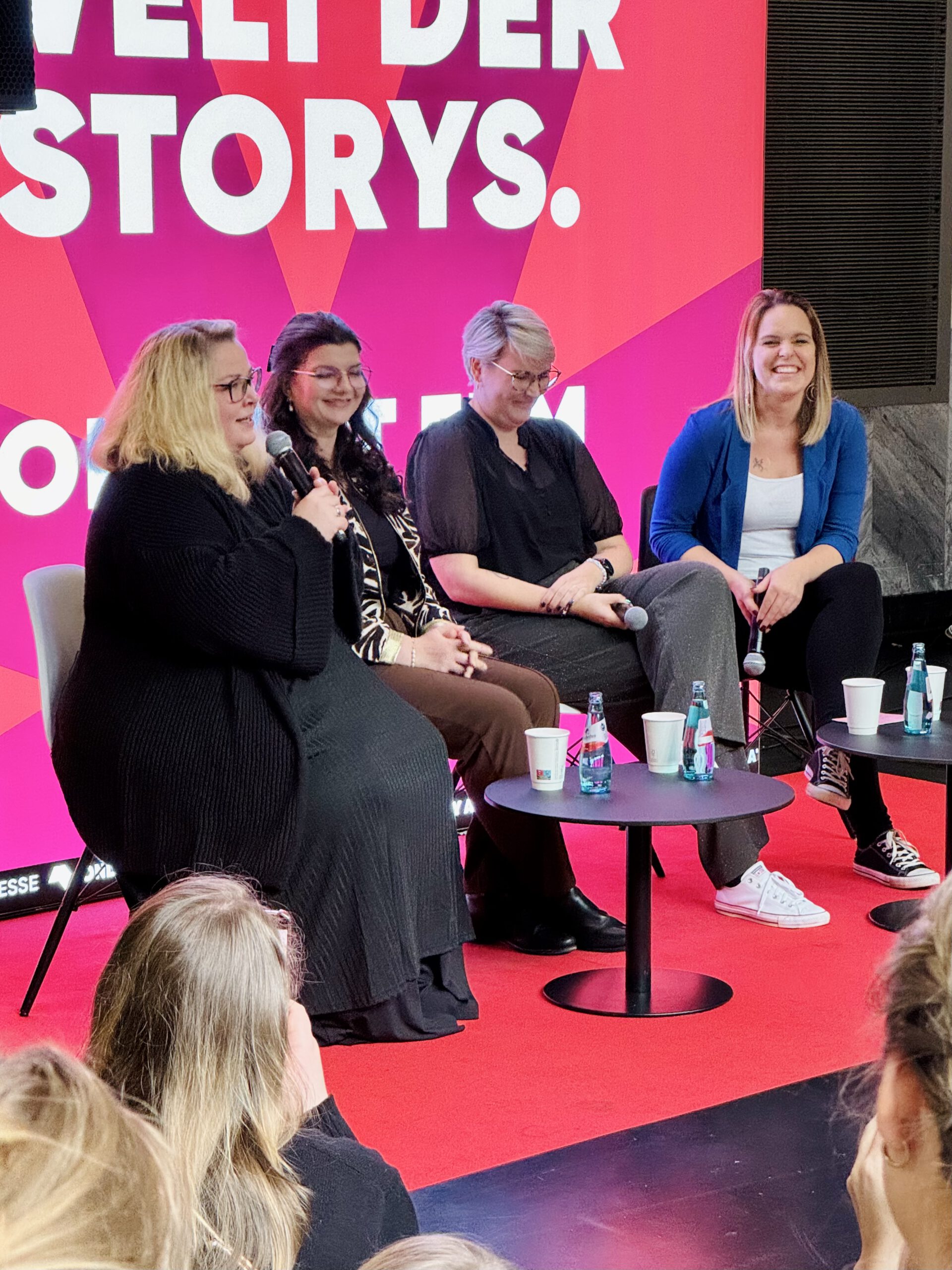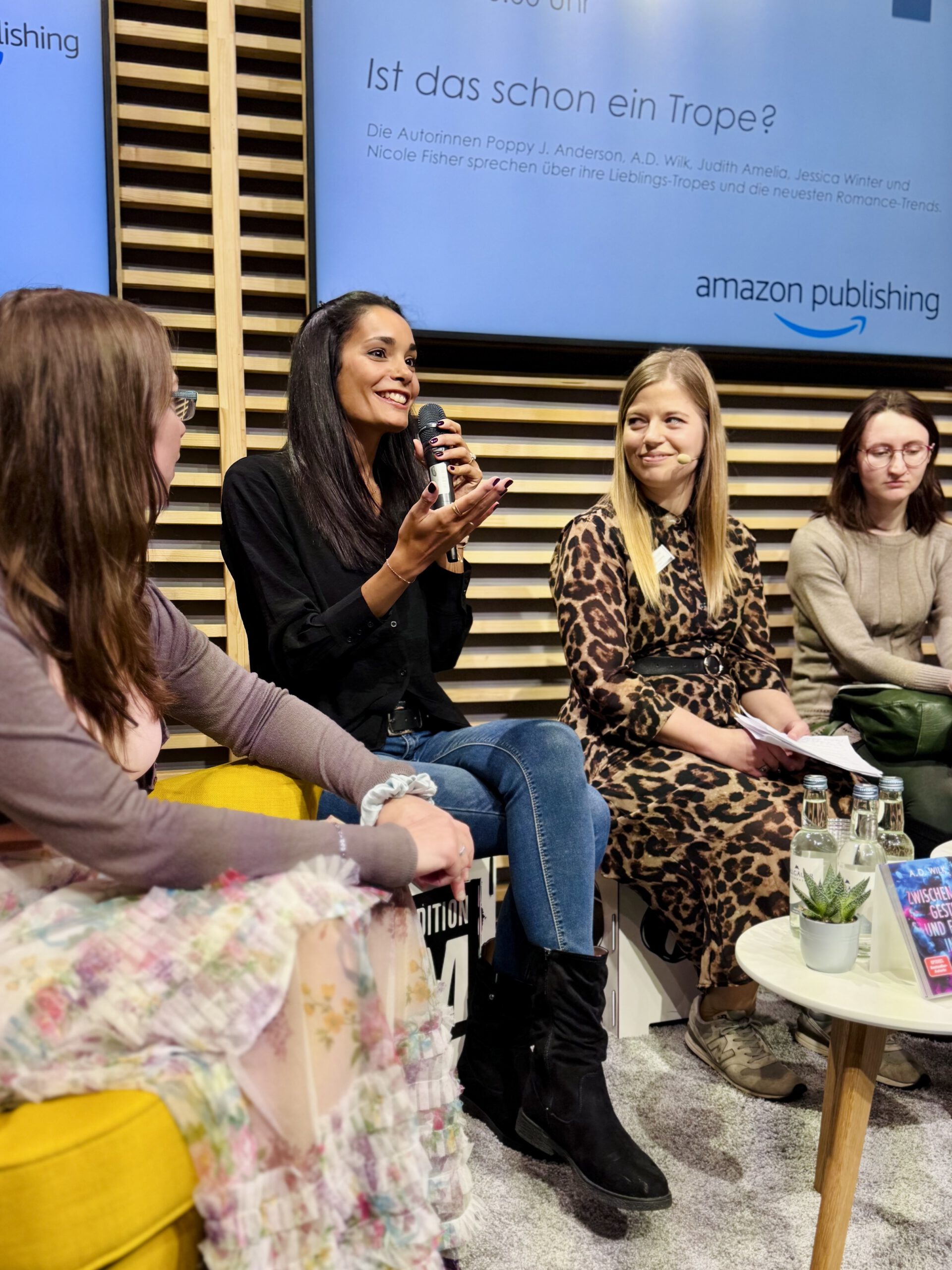 Am Amazon-Kindle-Stand hörten wir uns anschließend eine recht interessante Paneldiskussion zum Thema Tropes an. Besonders gefreut hat mich, dort Jessica Winter zu sehen – eine unglaublich tolle Autorin, deren Dramance-Bücher ich unglaublich gerne lese. Die Diskussion zeigte sehr gut, wie unterschiedlich Leserinnen und Leser mit Tropes umgehen und wie stark sie Entscheidungen für oder gegen ein Buch beeinflussen können.